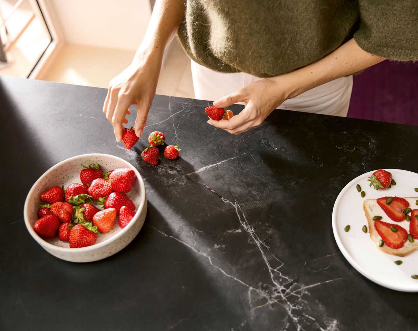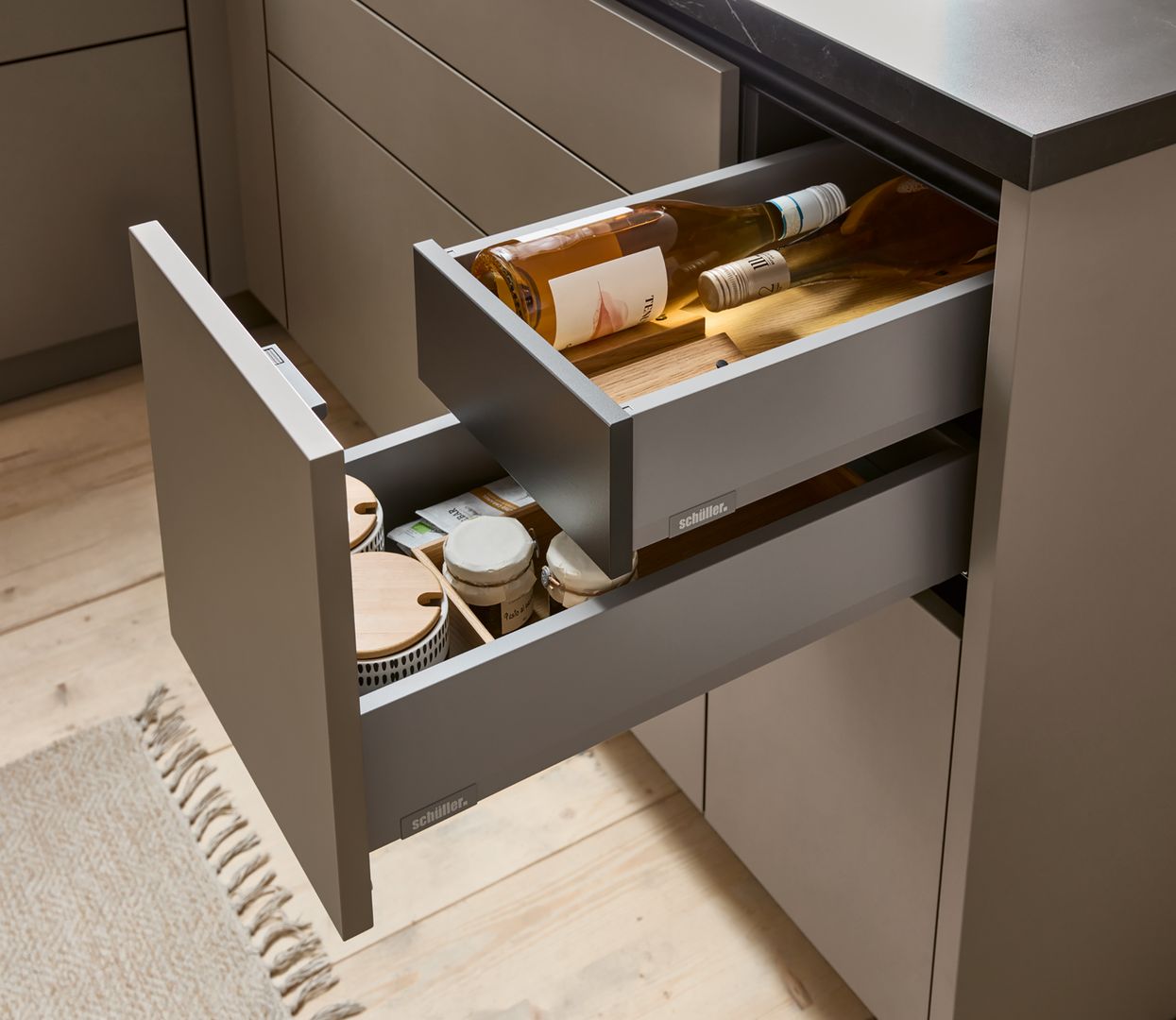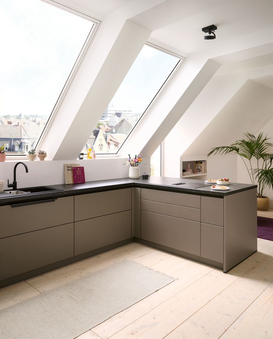 Die wandhängenden Schränke in warmem Sepiabraun schaffen eine leichte Atmosphäre und bieten ausreichend Stauraum. Mit dem Blick über die Stadt im Apartment mit Dachschräge duftet es morgens nach Kaffee – zubereitet auf der dunkel, edlen Arbeitsplatte in Marmor nero Nachbildung in einer Kaffeetasse aus dem Regal mit Glasschiebetür. Offenheit und Leichtigkeit strahlt die schräg eingepasste Küche aus und lädt zu spannenden Gesprächen um die Küchen-Halbinsel herum ein. Durch die Tip-On-Mechanik lassen sich Auszüge und Türen auch mit vollen Händen öffnen – das Highlight: die nachhaltige Front in Matera Colour mit Anti-Fingerprint-Eigenschaft hinterlässt keine Spuren vom Öffnen oder Schließen der Schränke.