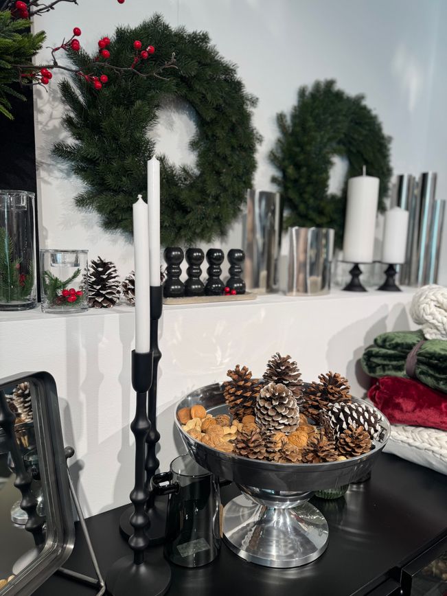 Knallige Akzente verabschieden sich – an ihre Stelle treten sanfte, erdige Nuancen. Dunkelbraun ist die tonangebende Weihnachtsfarbe und sorgt für eine elegante Tiefe. Ergänzt wird sie durch Waldgrün, Creme und gebrochene Weißtöne. Bordeauxrot ist wie in der Mode angesagt, immer perfekt: klassisches Rot-Grün-Weiß. Für alle, die es modern mögen, bleibt der Schwarz-Weiß-Look ein idealer Begleiter zu einem hellen, reduzierten Wohnstil.