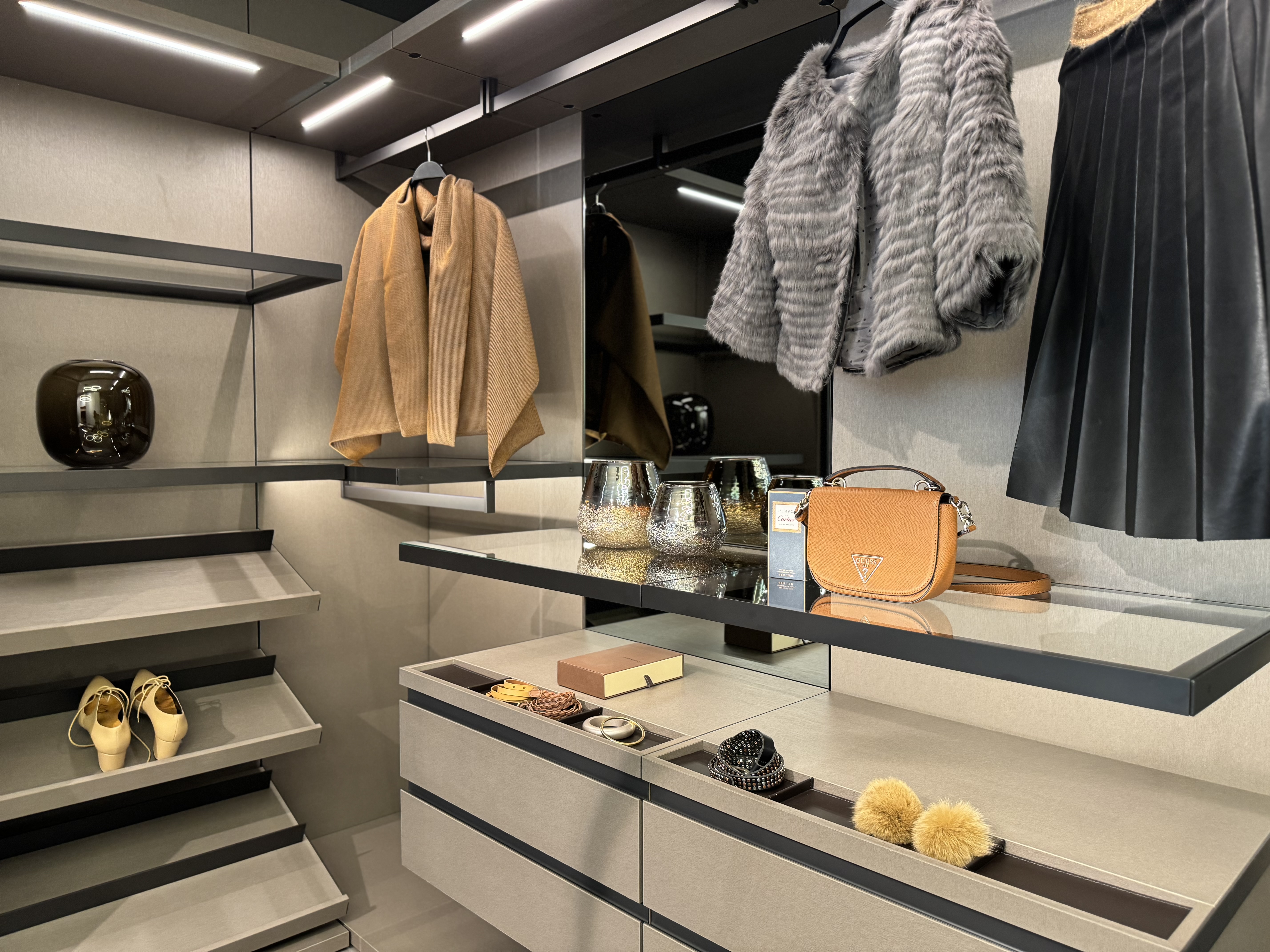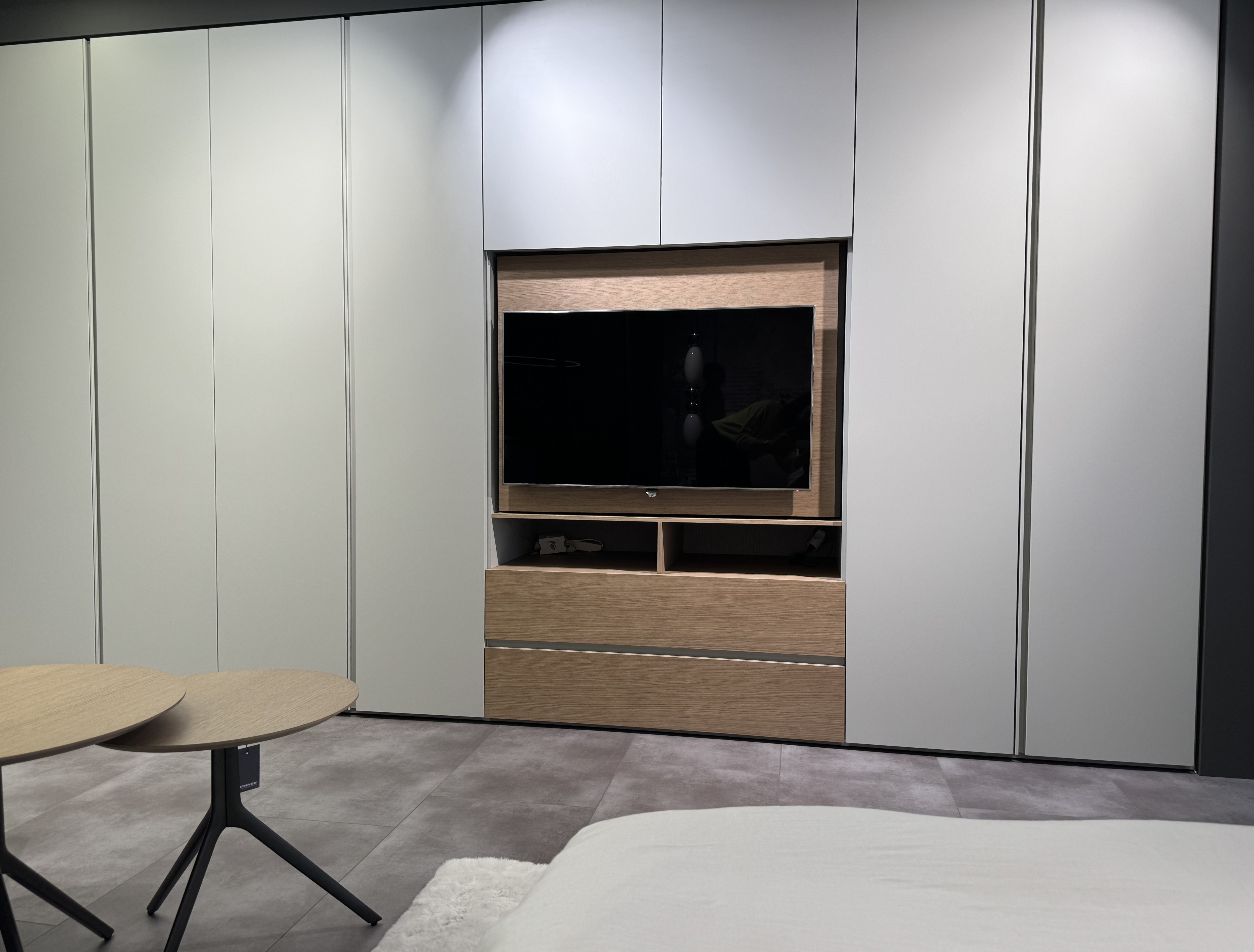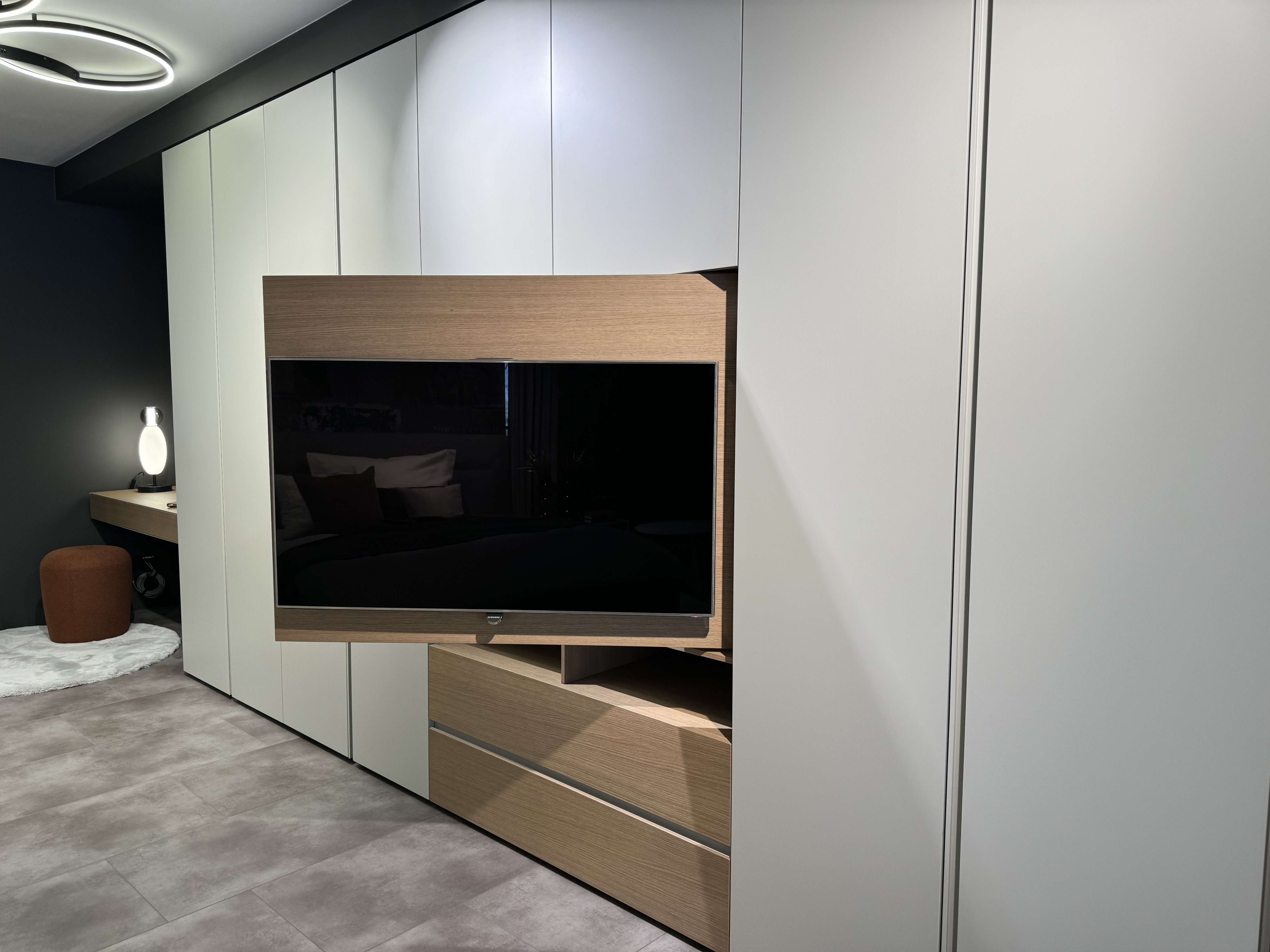 Highlight in unserer neuen Abteilung ist der begehbare Schrank, der jedes Frauenherz höher schlagen lässt und ganz beliebig gestaltbar ist. Das trendige Polsterbett in sanftem Beige besticht durch Design, Haptik und schöne Details. Der großzügige Einbauschrank integriert eine drehbare Fernsehwand, wobei der dahinterliegende Stauraum vielfältig genützt werden kann. Die moderne Beleuchtung rundet das elegante Ambiente ab und erzeugt eine beruhigende Atmosphäre. Zusammen mit dem flauschigen Teppich im Stil der 70er-Jahre entsteht ein Ort der Ruhe und Entspannung, der gleichzeitig ästhetisch ansprechend und funktional ist.