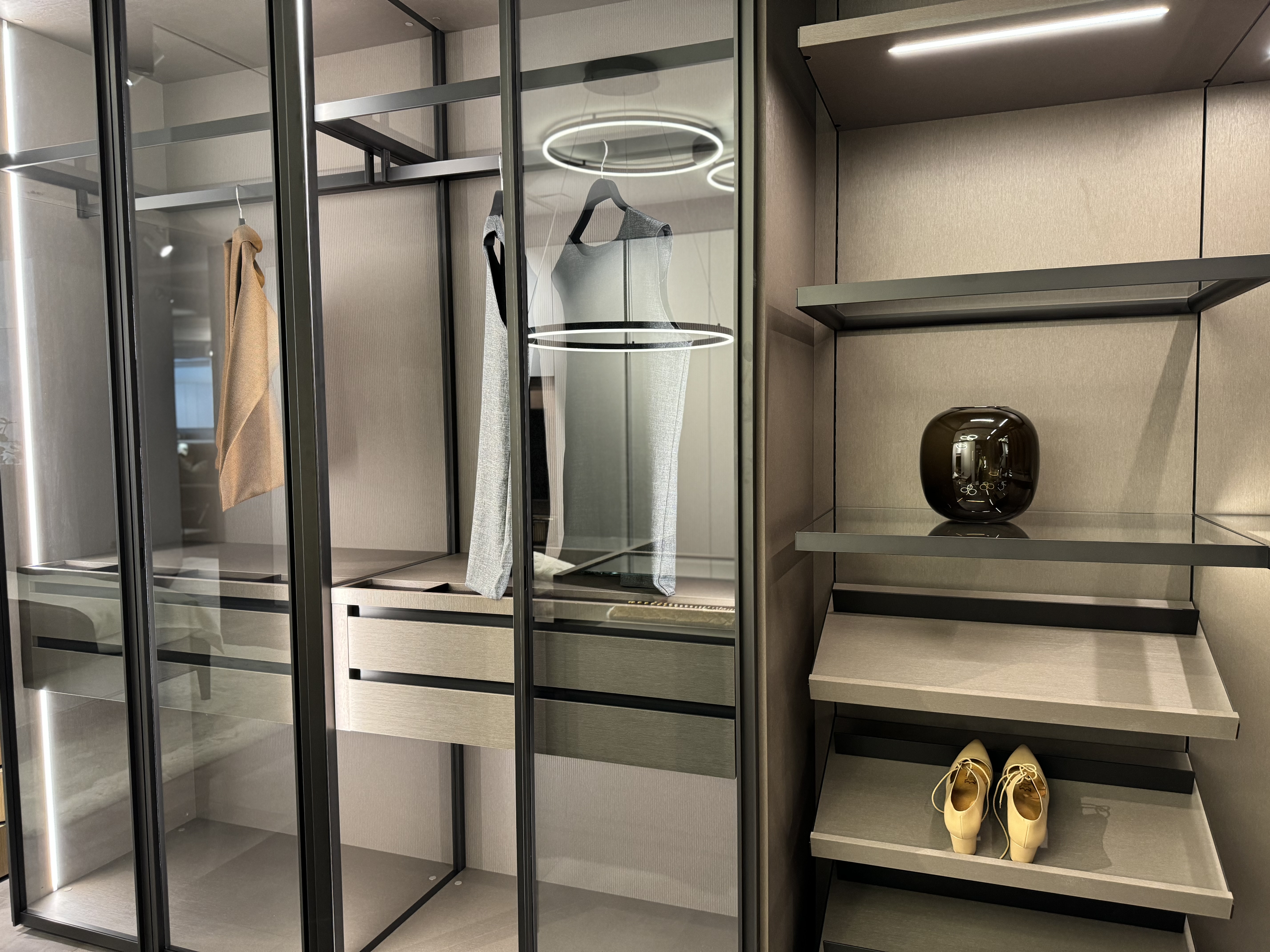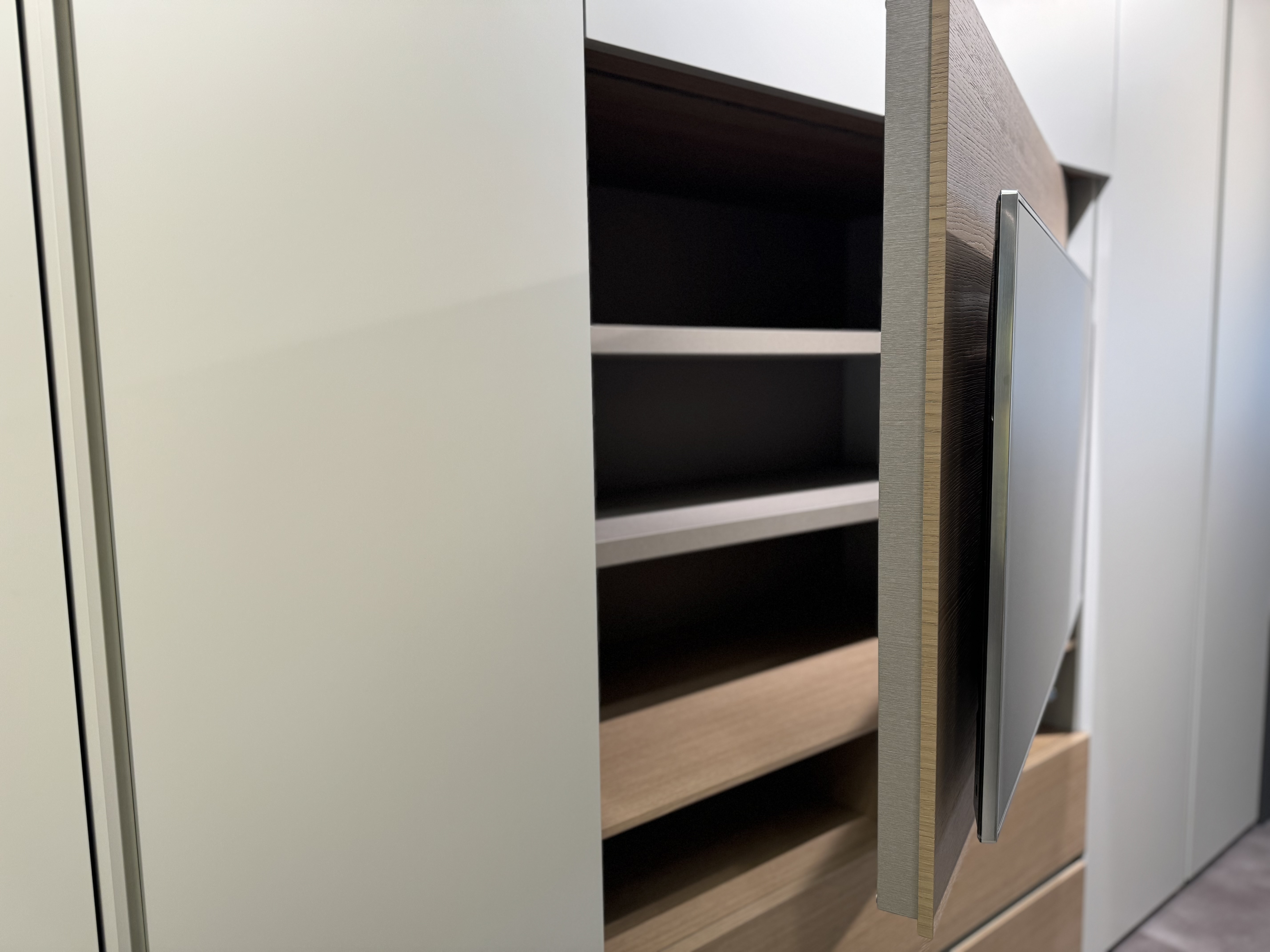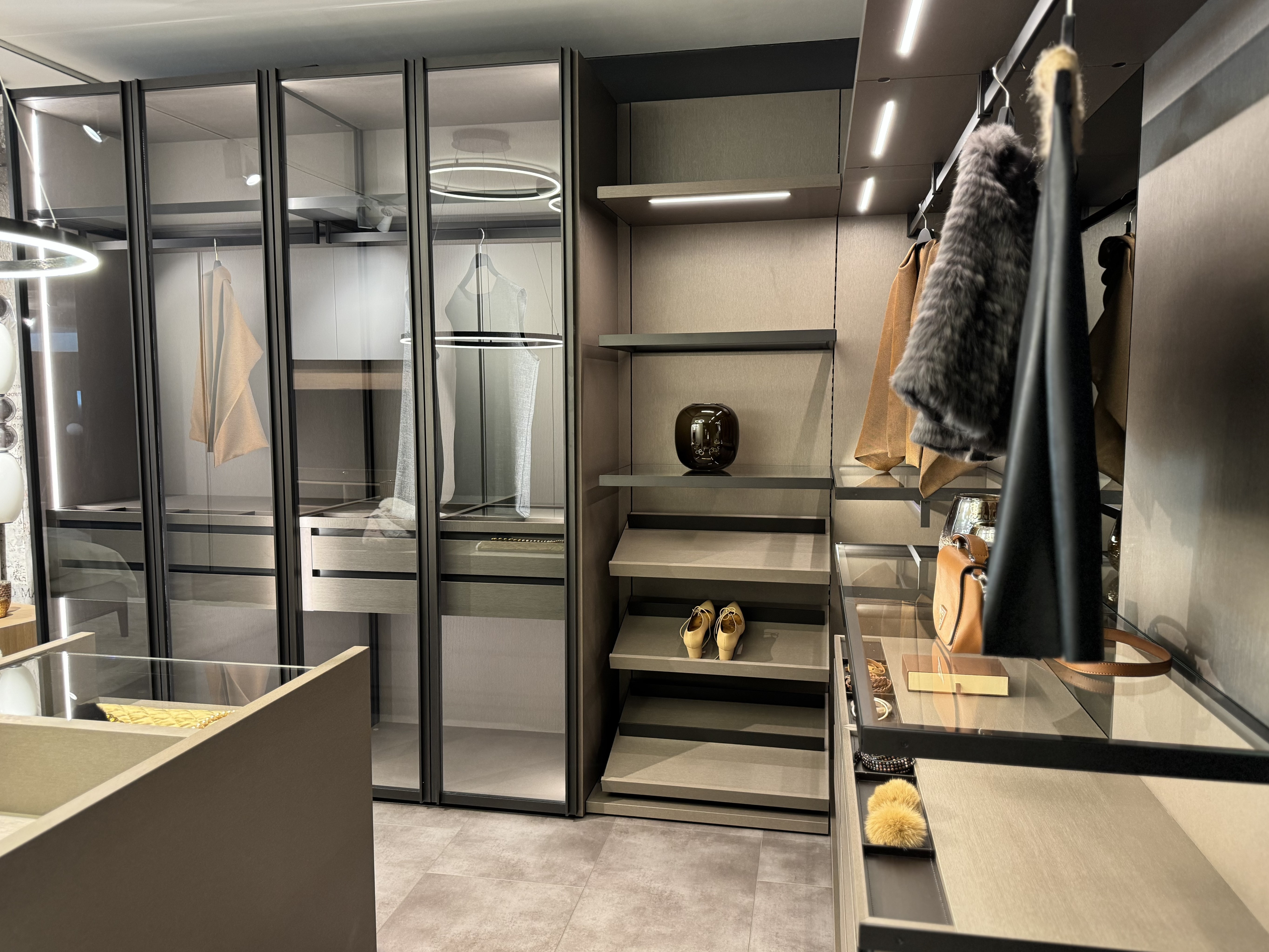 Highlight in unserer neuen Abteilung ist der begehbare Schrank, der jedes Frauenherz höher schlagen lässt und ganz beliebig gestaltbar ist. Das trendige Polsterbett in sanftem Beige besticht durch Design, Haptik und schöne Details. Der großzügige Einbauschrank integriert eine drehbare Fernsehwand, wobei der dahinterliegende Stauraum vielfältig genützt werden kann. Die moderne Beleuchtung rundet das elegante Ambiente ab und erzeugt eine beruhigende Atmosphäre. Zusammen mit dem flauschigen Teppich im Stil der 70er-Jahre entsteht ein Ort der Ruhe und Entspannung, der gleichzeitig ästhetisch ansprechend und funktional ist.
