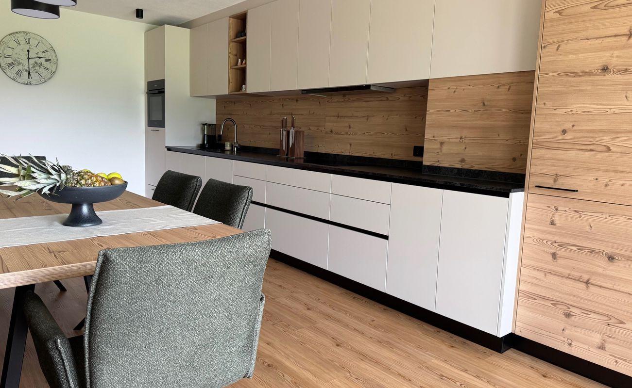 In diesem Projekt war Fingerspitzengefühl gefragt: Der schmale Grundriss stellte besondere Anforderungen an die Planung. Unser Lösungskonzept: eine klare Küchenzeile, die trotz kompakter Fläche großzügig ist und jede Menge Platz bietet.