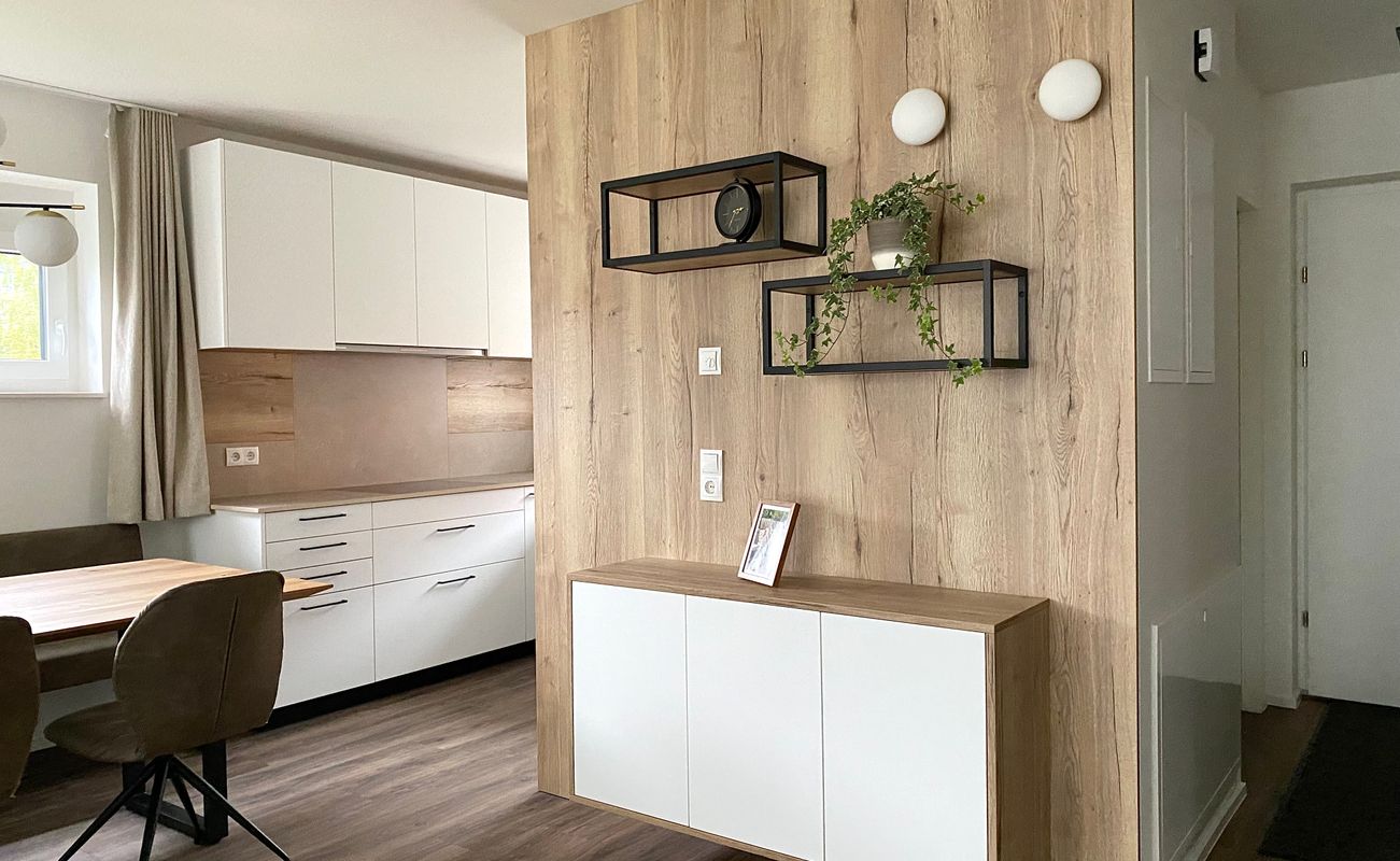 Das Wichtigste ist aber die perfekte Raumaufteilung bzw. -ausnützung, um die wir uns gerne kümmern. Kochen, Essen, Wohnen ergeben auch hier im abgestimmten Materialmix und durch die überlegte Anordnung ein harmonisches Ganzes. Wie aus einem Guss wirken außerdem Diele und Schlafzimmer. Außerdem durften wir uns um die Fensterdekoration, Accessoires und Lichtgestaltung kümmern - die I-Tüpfchen einer gemütlichen Wohngestaltung.