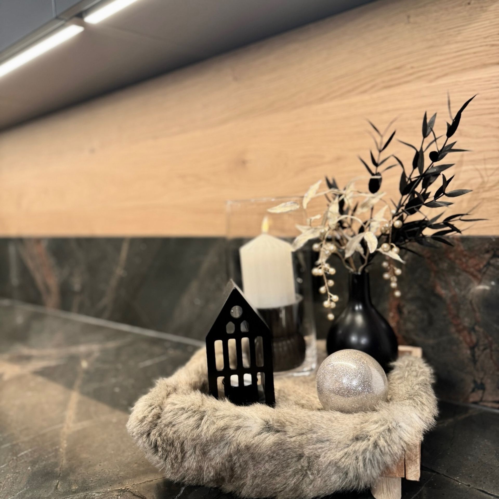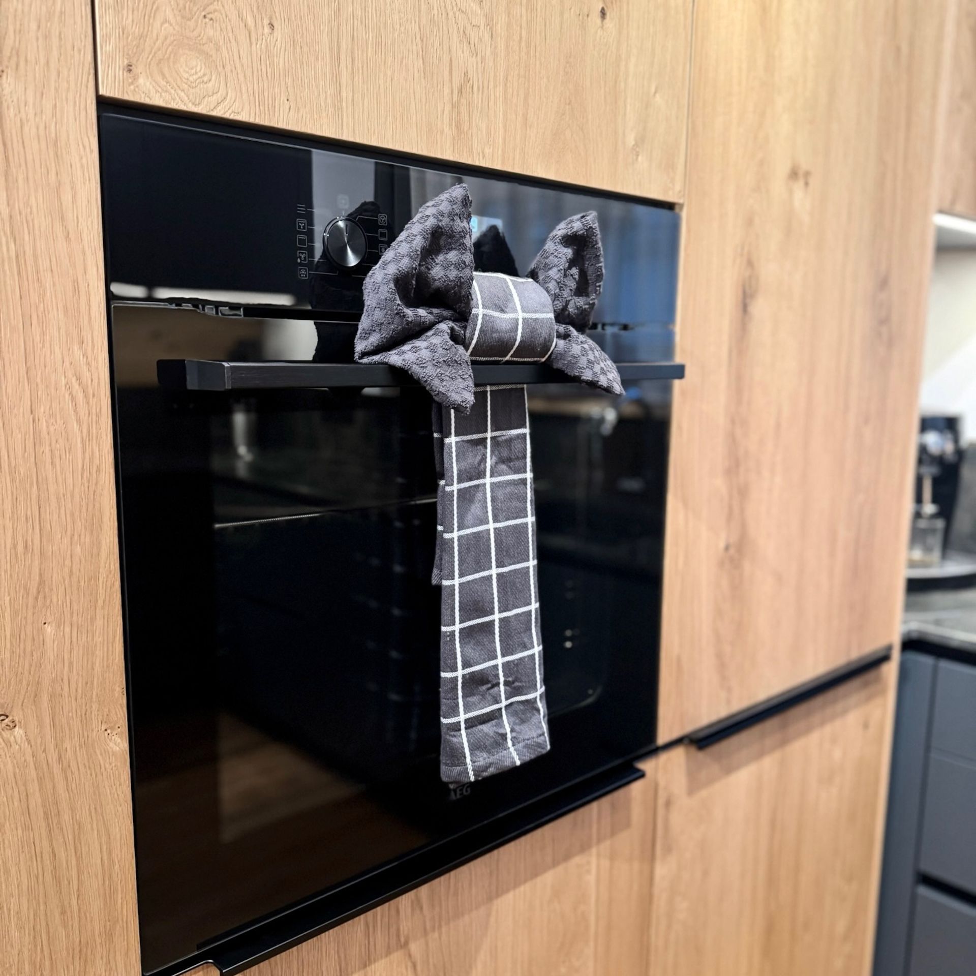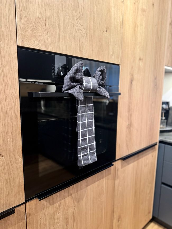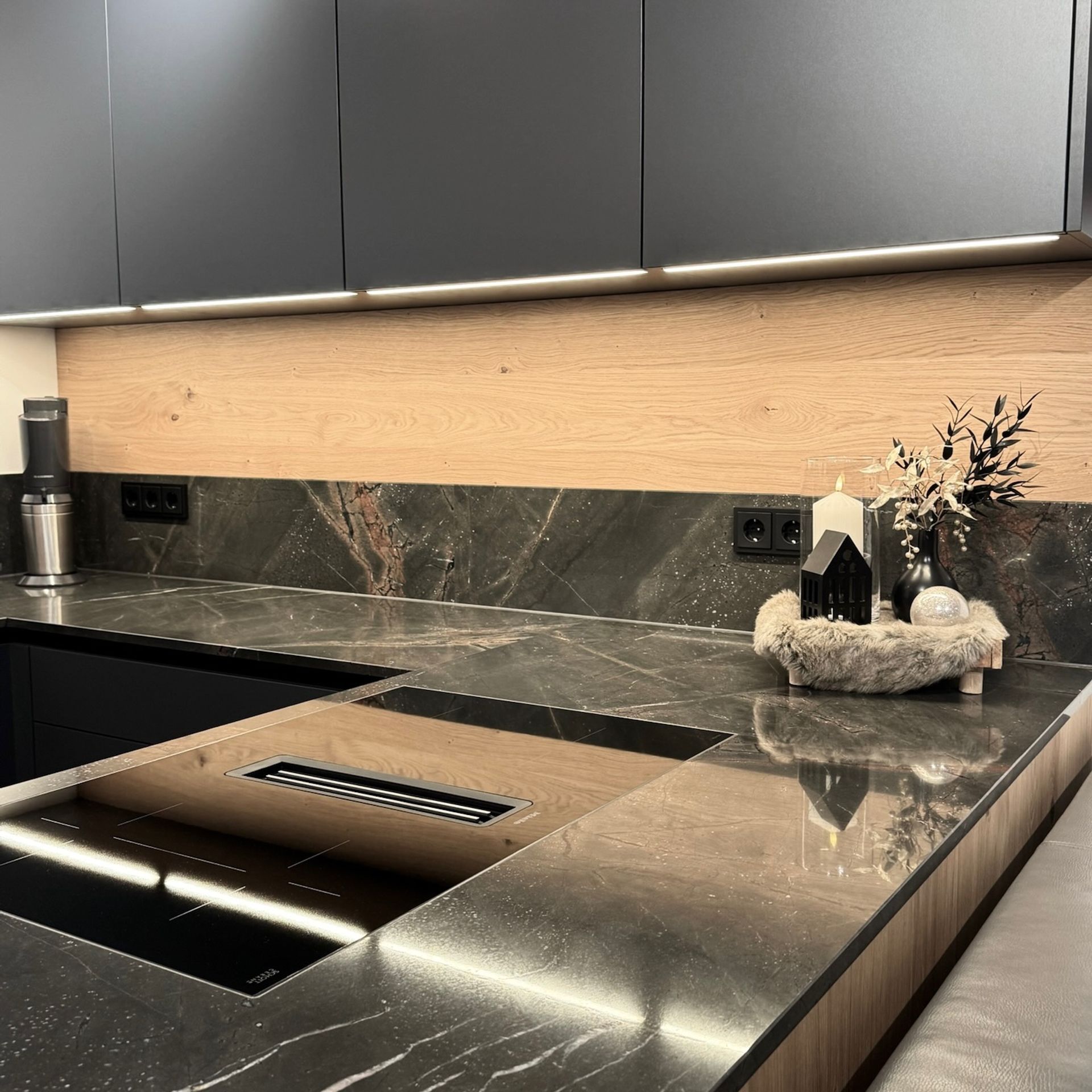 Sie wirken modern, ruhig und gleichzeitig natürlich – genau diese Balance stand im Mittelpunkt bei der Planung dieser Familienküche. Die grifflosen Fronten in Eisengrau und Orion werden durch Wildeiche bewusst aufgelockert und schaffen eine Atmosphäre, die zeitlos und wohnlich zugleich ist.