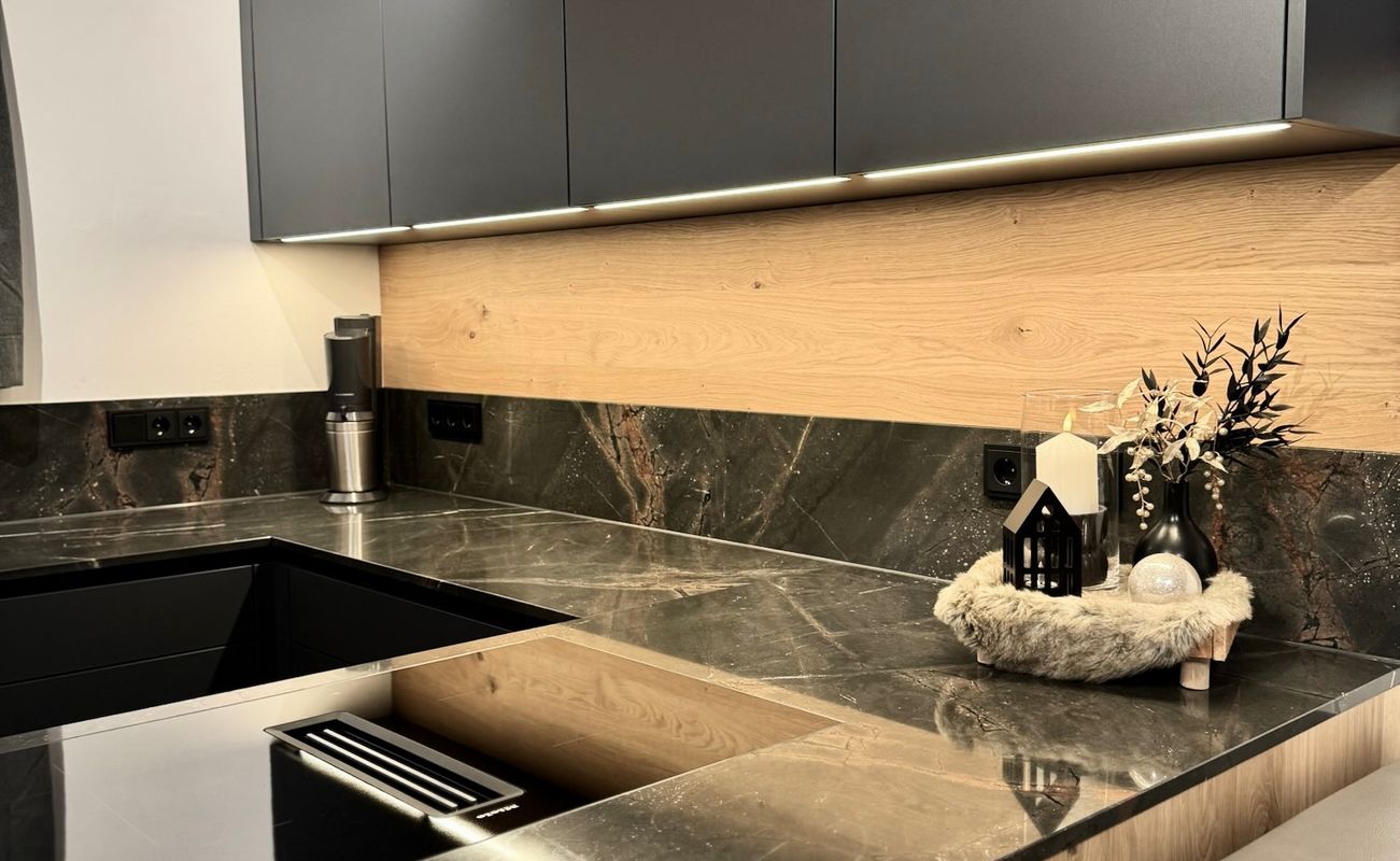 Dunkle Küchen in Kombination mit warmem Holz liegen im Trend.
