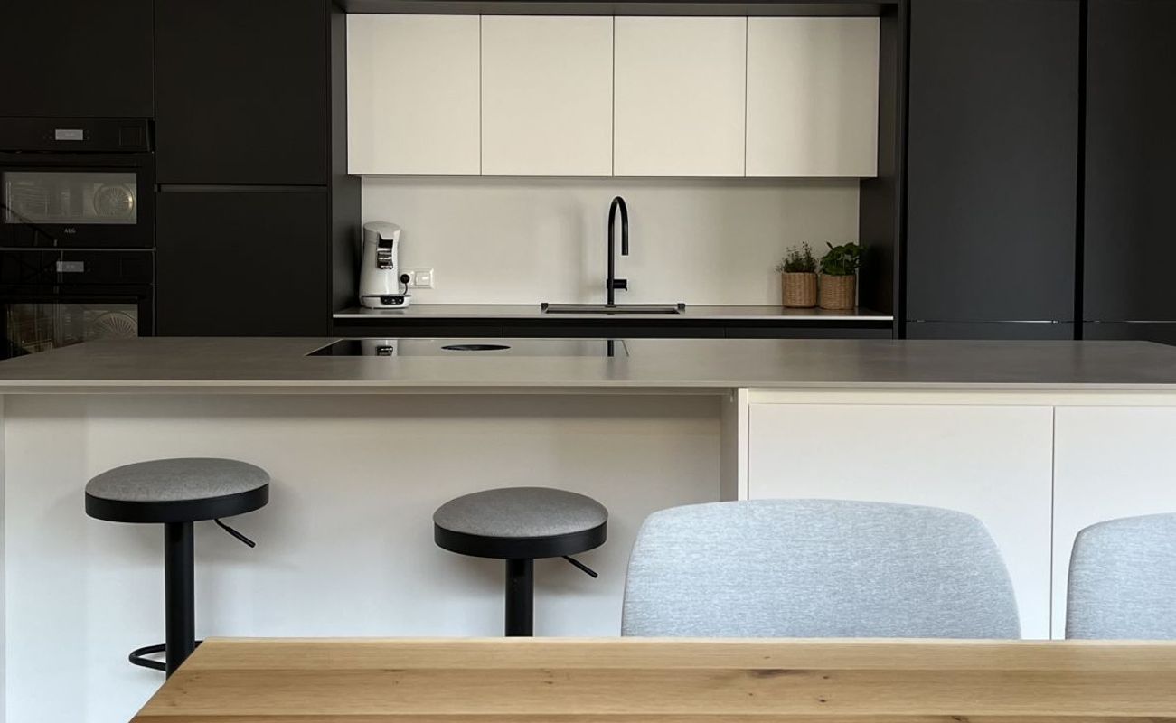 Unsere Einrichter beweisen darüber hinaus wieder einmal viel Gespür für eine beruhigende, zeitlose Nicht-Farben-Welt, die eine harmonische, ganz besonders feine Wohnstimmung erzeugt. So bricht beispielsweise die hochwertige Keramikplatte in Betonoptik die Schwarz-Weiss-Optik gekonnt.
