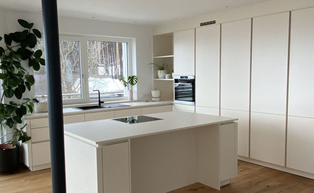 Ein warmer Cremeton ist immer eine beliebte und perfekte Wahl! Diese Küche strahlt in Verbindung mit dem Naturholzboden, den klaren Linienführungen und viel Freiraum eine sanfte Eleganz aus.