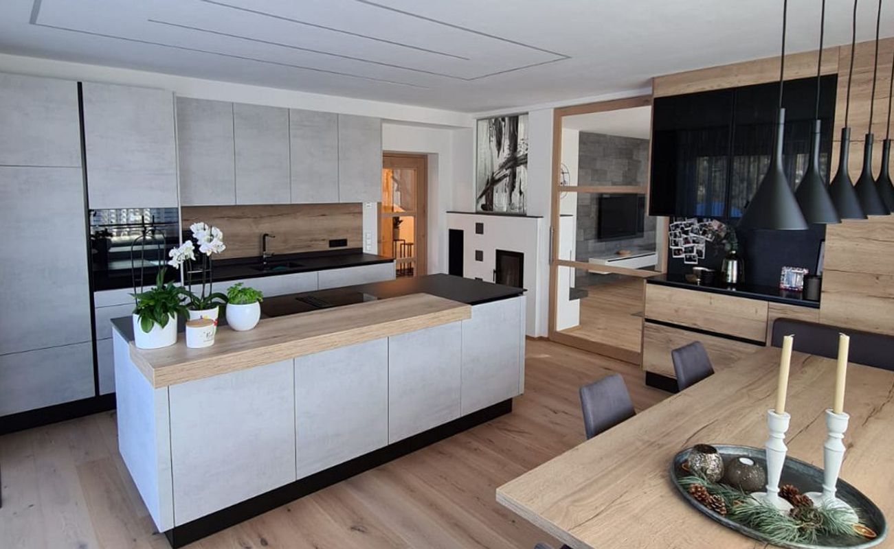 Trendige Materialien und Farben wie Beton oder Schwarz mischen sich mit viel warmen Holz zu einem Ambiente, in dem sich die jungen Einrichter auf Anhieb wohlfühlten. Küche, Essbereich und Boden kommen hier ganz aus Aichner-Hand.