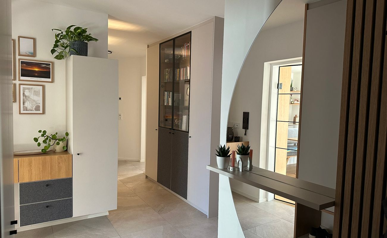 Diese maßgefertigte Garderobe vereint Funktionalität und Design in besonderer Weise. Schrankverbau bzw. Schuhschrank in edlem Dekor Kaschmir bieten großzügigen Stauraum und sorgen für ein harmonisches Gesamtbild. Ein großer Spiegel verleiht dem Eingangsbereich zusätzliche Tiefe, während das Akustik-Paneel nicht nur optisch überzeugt, sondern auch für eine angenehme Raumakustik sorgt und den Zählerkasten elegant verbirgt. Sogar die Garderobenhaken sind auf das Umfeld abgestimmt.