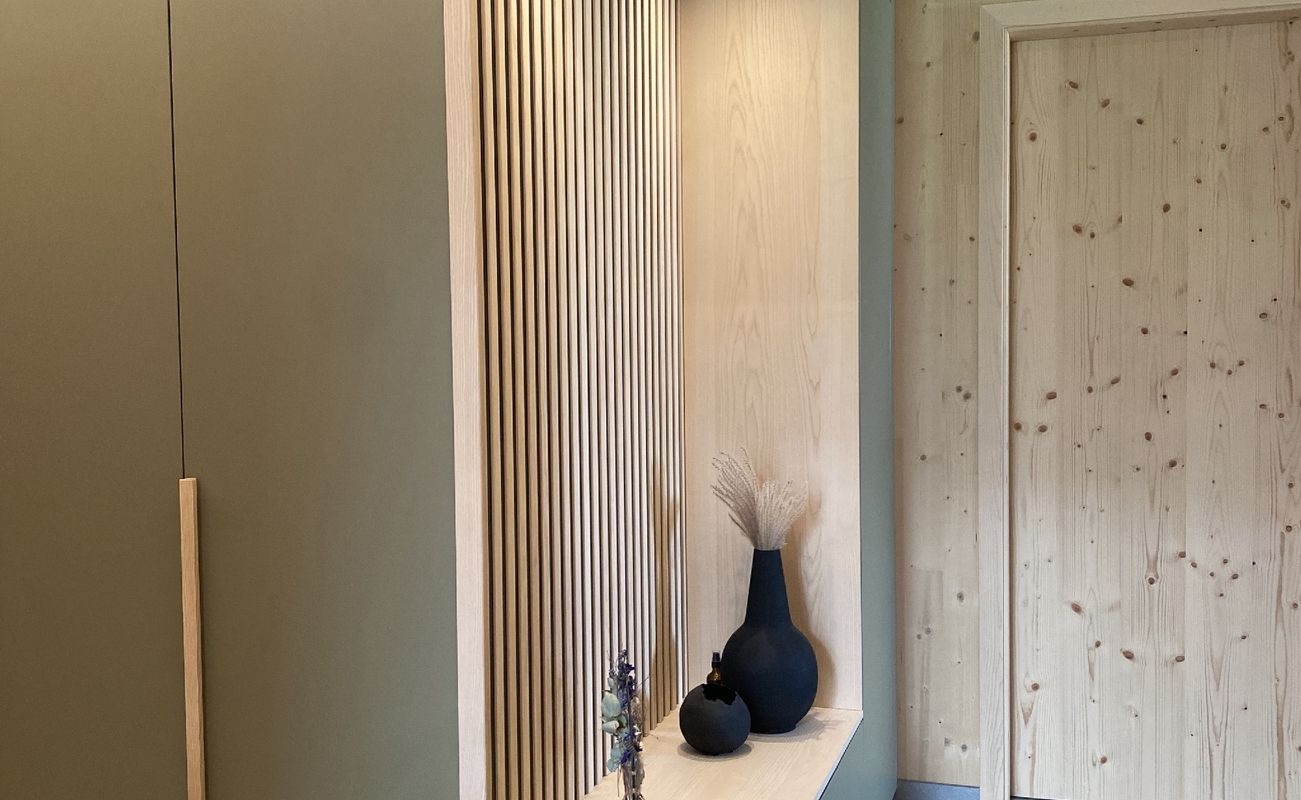 Unser Anspruch war es, Räume zu schaffen, die nicht nur funktional, sondern vor allem stimmig und atmosphärisch sind. Dies zeigt sich vor allem im Garderobenbereich: Jedes Detail, jede Oberfläche und jede Linie ist Teil eines durchdachten Gesamtkonzeptes. So wird aus einzelnen Räumen ein Zuhause, das Natürlichkeit und Persönlichkeit ausstrahlt. Dies wird nicht zuletzt durch die Dekoration im leichten Boho-Style gekonnt unterstrichen.