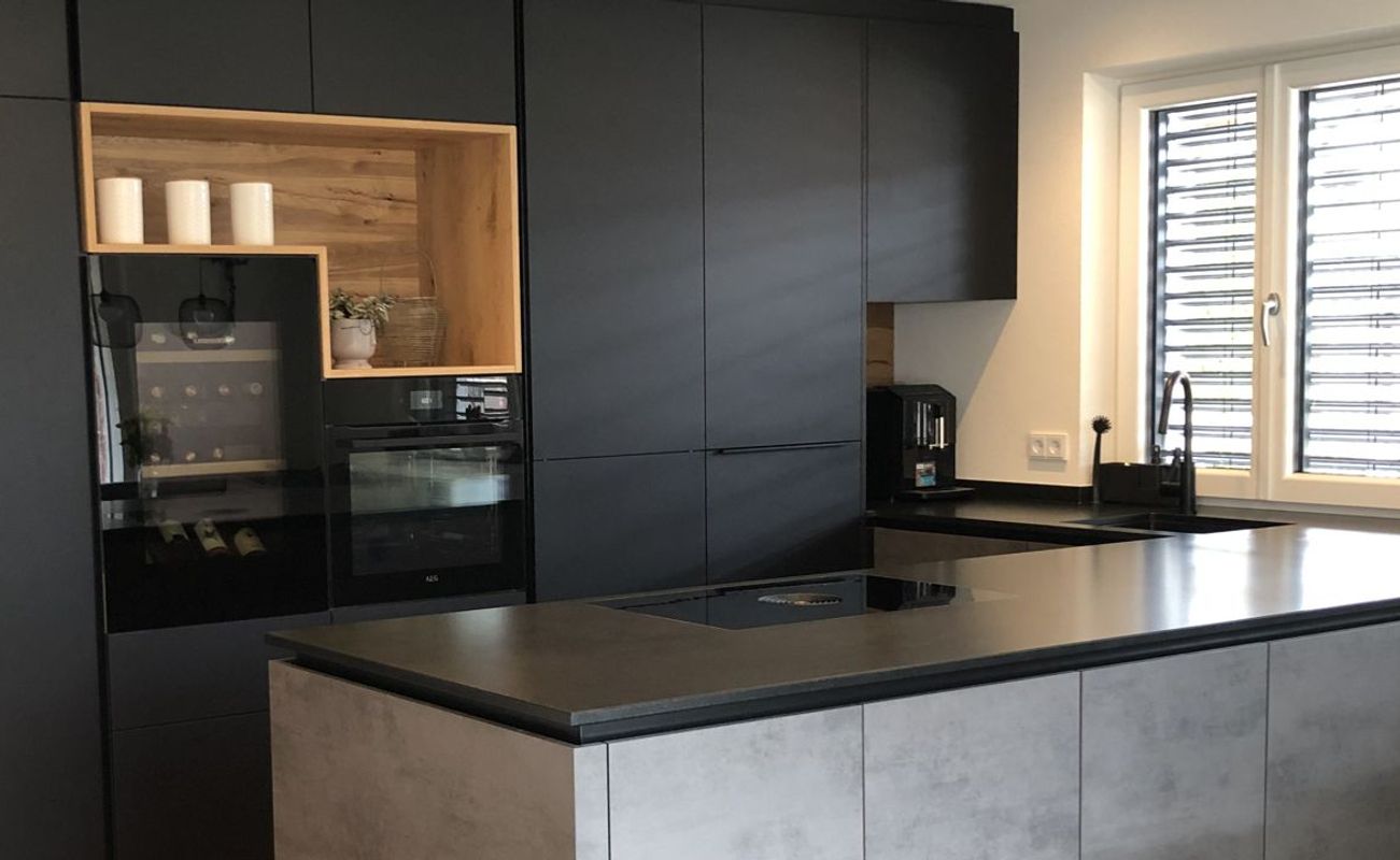 Das Dunkel der Fronten bildet einen schönen Kontrast zum Holzboden. Die graue Essgruppe schafft eine schöne Verbindung zur Kochinsel in Beton. Die hochwertige Steinarbeitsplatte ist nicht nur ein optisches Highlight, sondern auch strapazfähig und pflegeleicht.