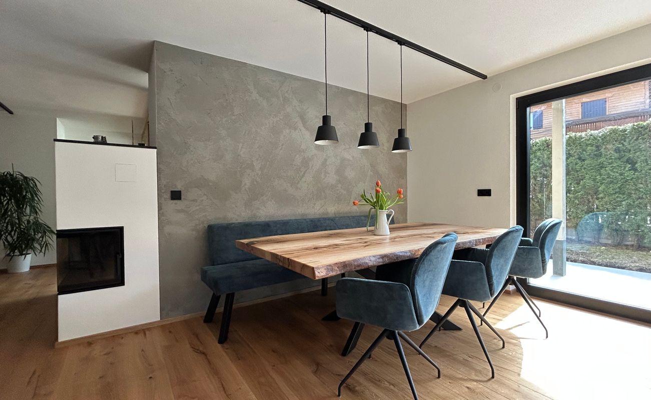 Diese Wohnküche zeigt, wie modernes Design und natürliche Materialien perfekt harmonieren können. Die matten Fronten in elegantem Grau verleihen dem Raum eine klare, zeitgemäße Linie. Besonderer Blickfang: die markante Theken- und Esstischplatte mit echter Baumkante – individuell, charaktervoll und absolut im Trend.