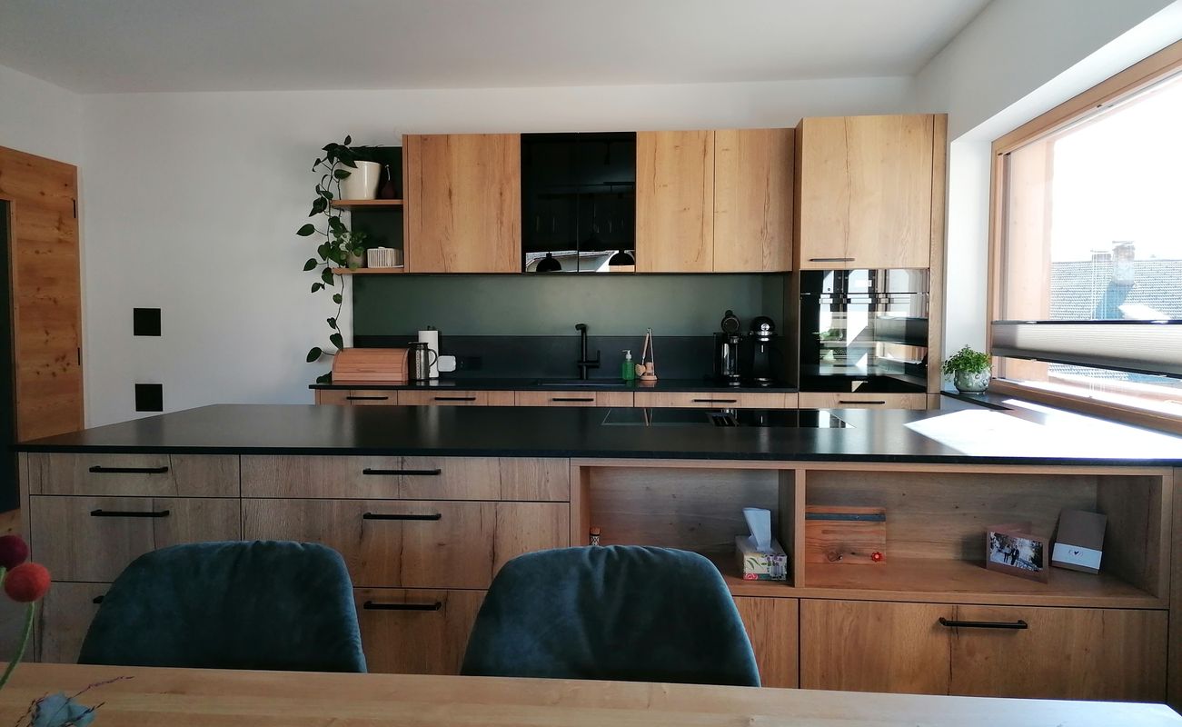 Mit Fronten in Eiche mit schwarzen Griffen, einer hochwertigen Natursteinarbeitsplatte in edlem Schwarz und der Rückwand in Grün vereint diese Küche zeitlose Ästhetik und viel Gemütlichkeit. Für eine ruhige, aufgeräumte Atmosphäre sorgt auch die klare Linienführung und das reduzierte Design. Besonderes Highlights sind die praktische Kochinsel mit großzügigem Stauraum, das integrierte Spülbecken mit schwarzer Armatur. Hochwertige Elektrogeräte und durchdachte Stauraumlösungen sowie offene Regalelemente runden das stimmige Konzept ab. Der in grün gehaltene Essbereich fügt sich ebenfalls stimmig in das harmonische Gesamtbild ein. Eine Küche, der nicht nur funktional überzeugt, sondern auch ein echter Blickfang ist, weil er modernes Design mit natürlicher Wohnlichkeit verbindet.