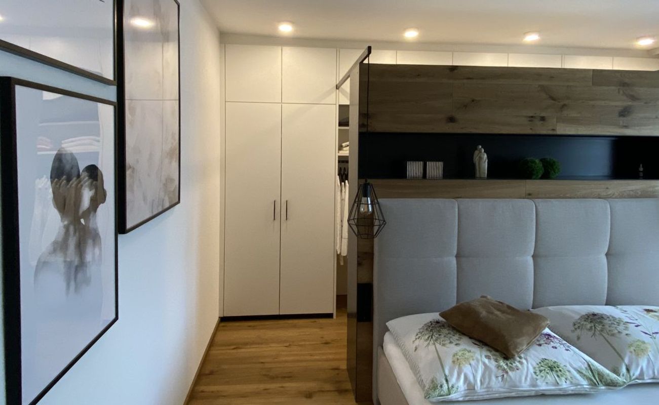 Um Platz für einen begehbaren Schrank zu erhalten, musste dieses Schlafzimmer komplett neu durchdacht werden. Das Ergebnis kann sich sehen lassen. Es ist nicht nur super-praktisch, sondern auch wunderschön geworden. Alles neu, alles Aichner: Möbel, Boden, Vorhänge, Bettwäsche und Accessoires.