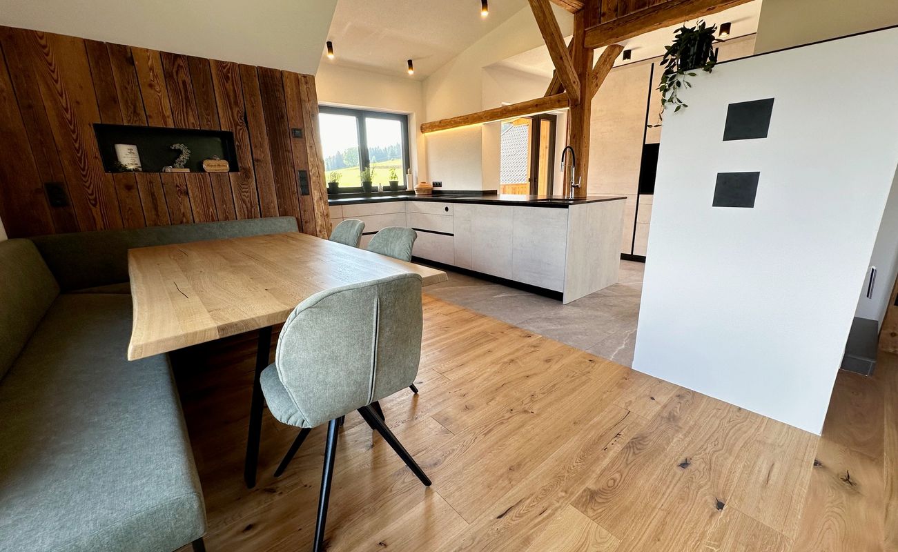 Die Küche wurde hier um die tragende Säule für den Dachstuhl herumgebaut und das Altholz als Gestaltungselement in der Raumplanung immer wieder aufgenommen - alles sorgt für viel Gemütlichkeit. Die Nische hinter dem Essbereich bietet Stauraum für Geräte und Abstellfläche für Bücher & Dinge, die nicht sofort ins Auge fallen.