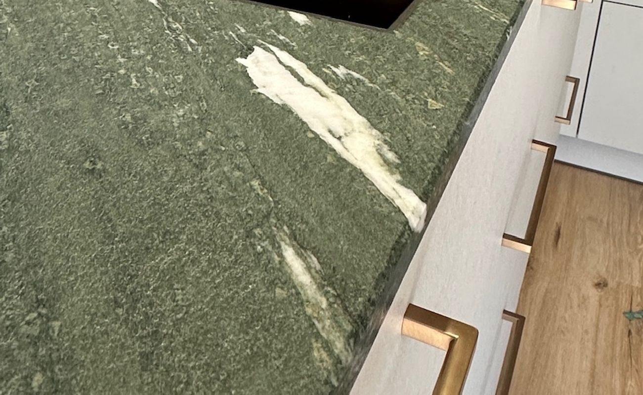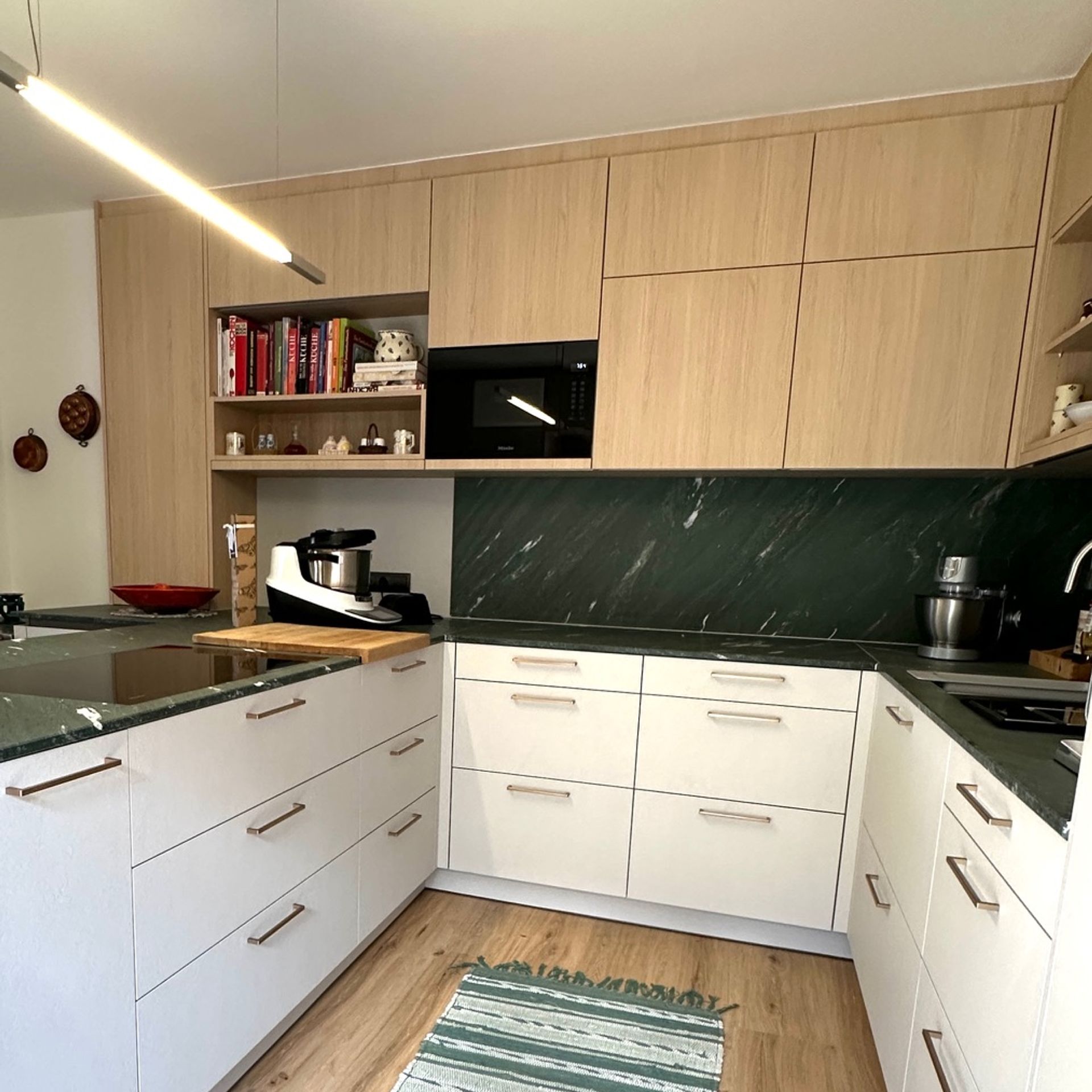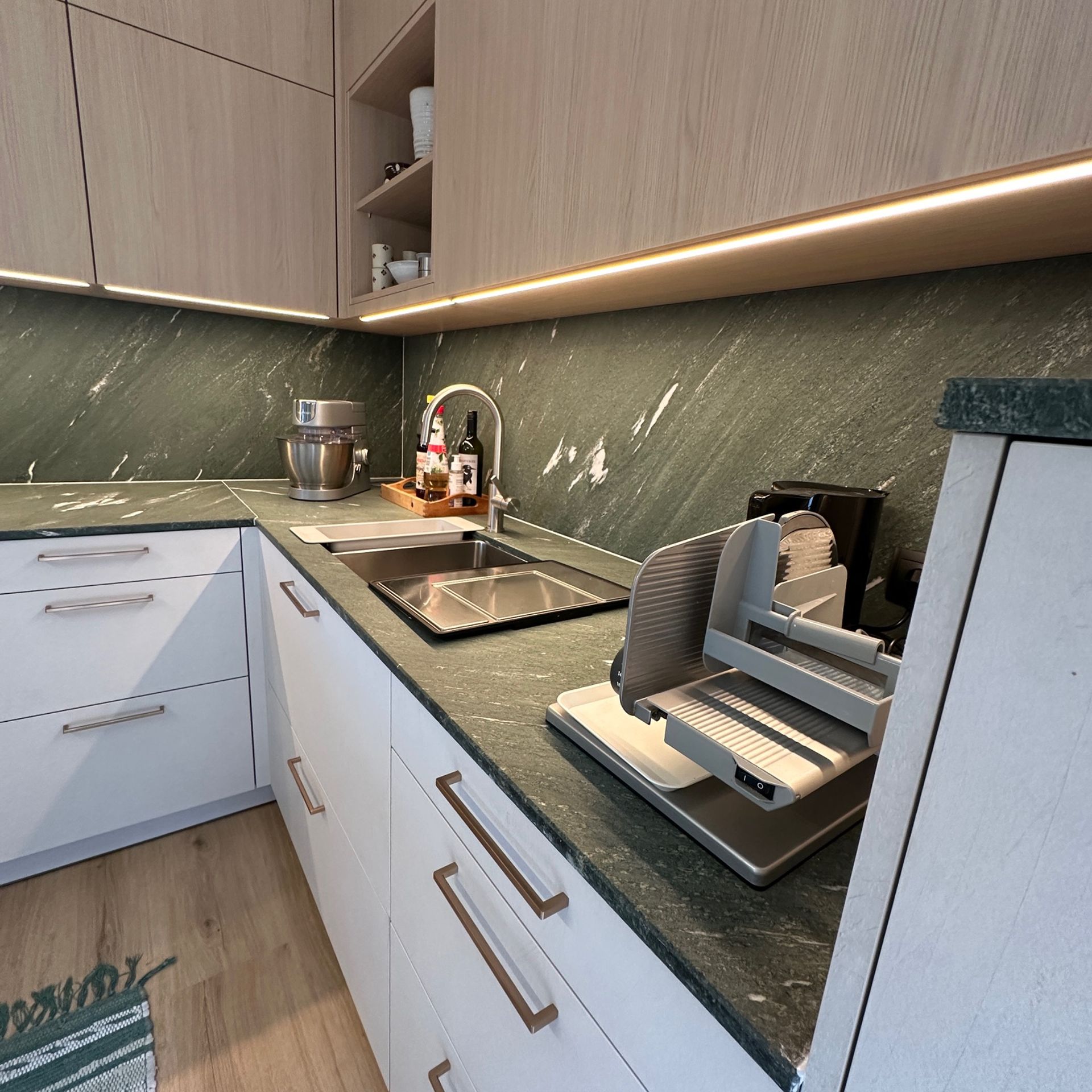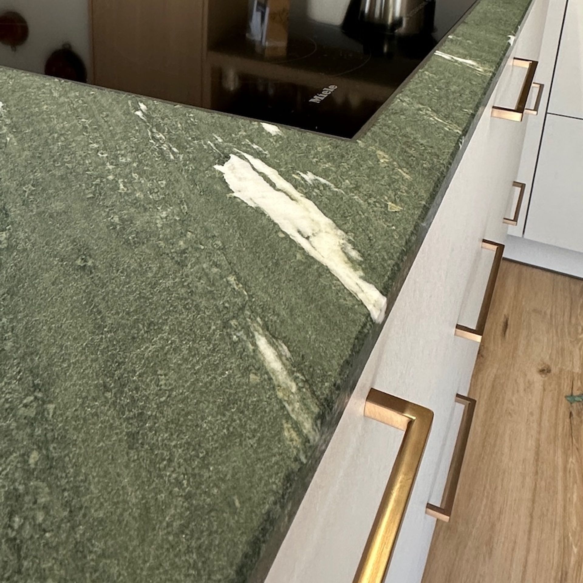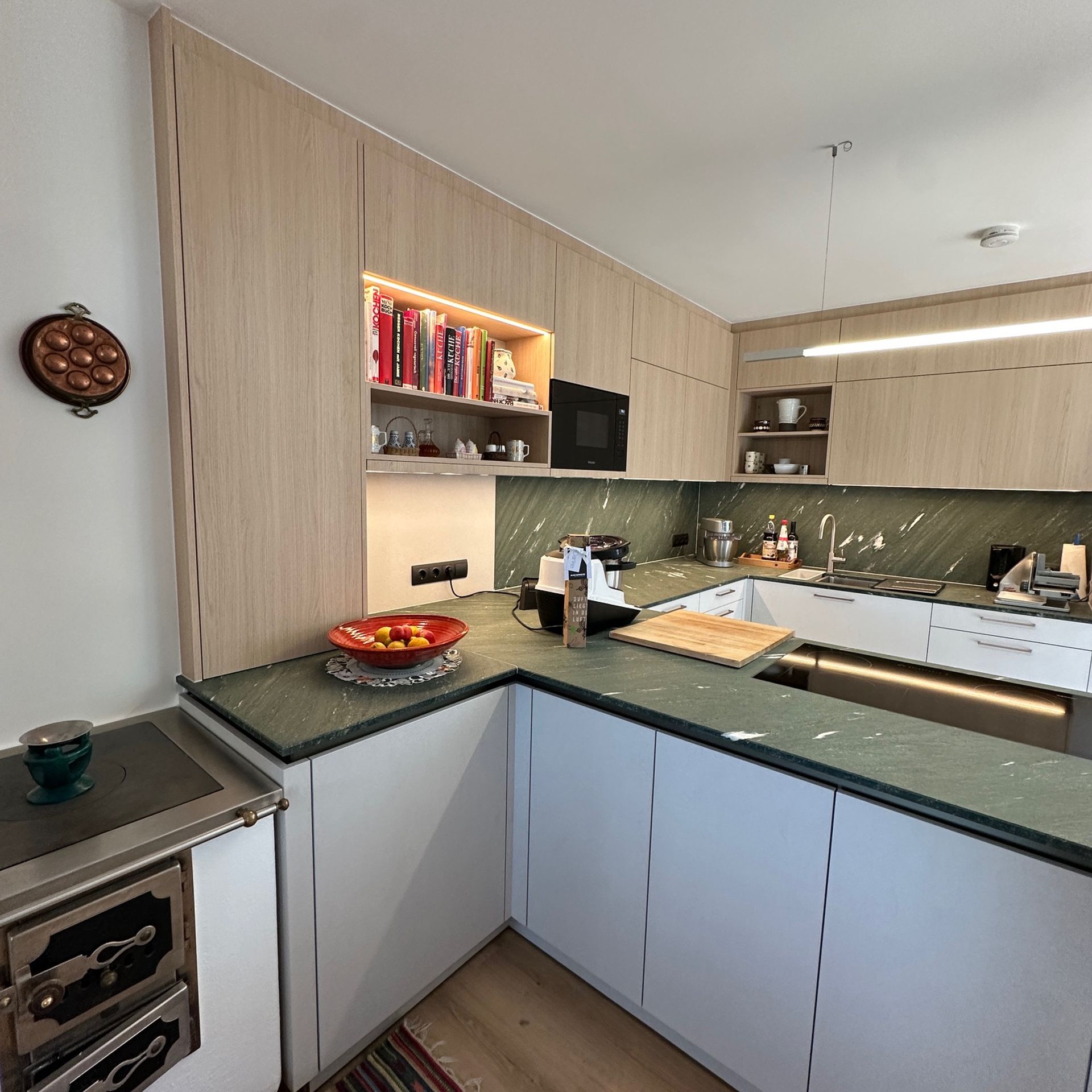 Die große Veränderung zeigt sich aber an der Materialität. Star der neuen Küche ist die Arbeitsplatte “Alpengrün”. Sie setzt ein starkes, natürliches Statement und bringt gleichzeitig ein Stück Osttirol in die Küche, der Naturstein wird nämlich im Defereggental abgebaut. Durch die helle Küchenfront Cemento Bianco und der hellen Eiche kommt der Stein erst richtig zur Geltung. Griffe und Griffmulden in Messing runden das Gesamtbild ab.