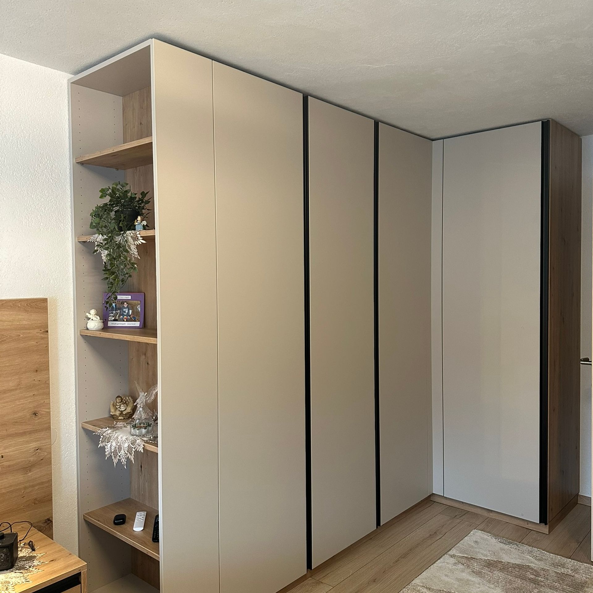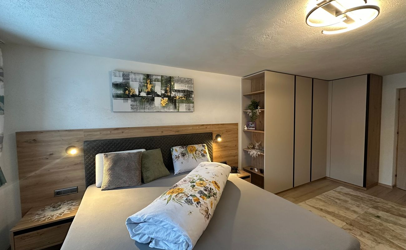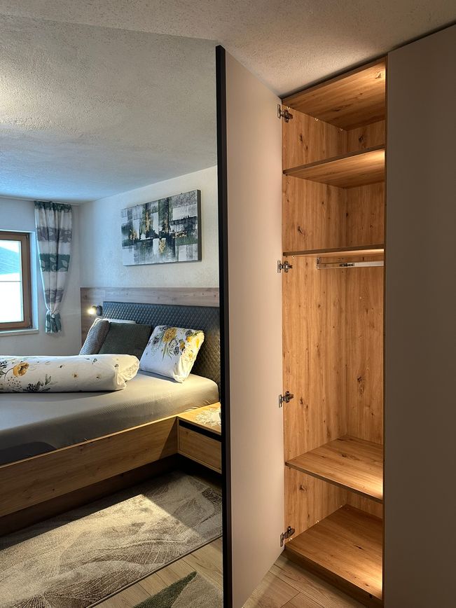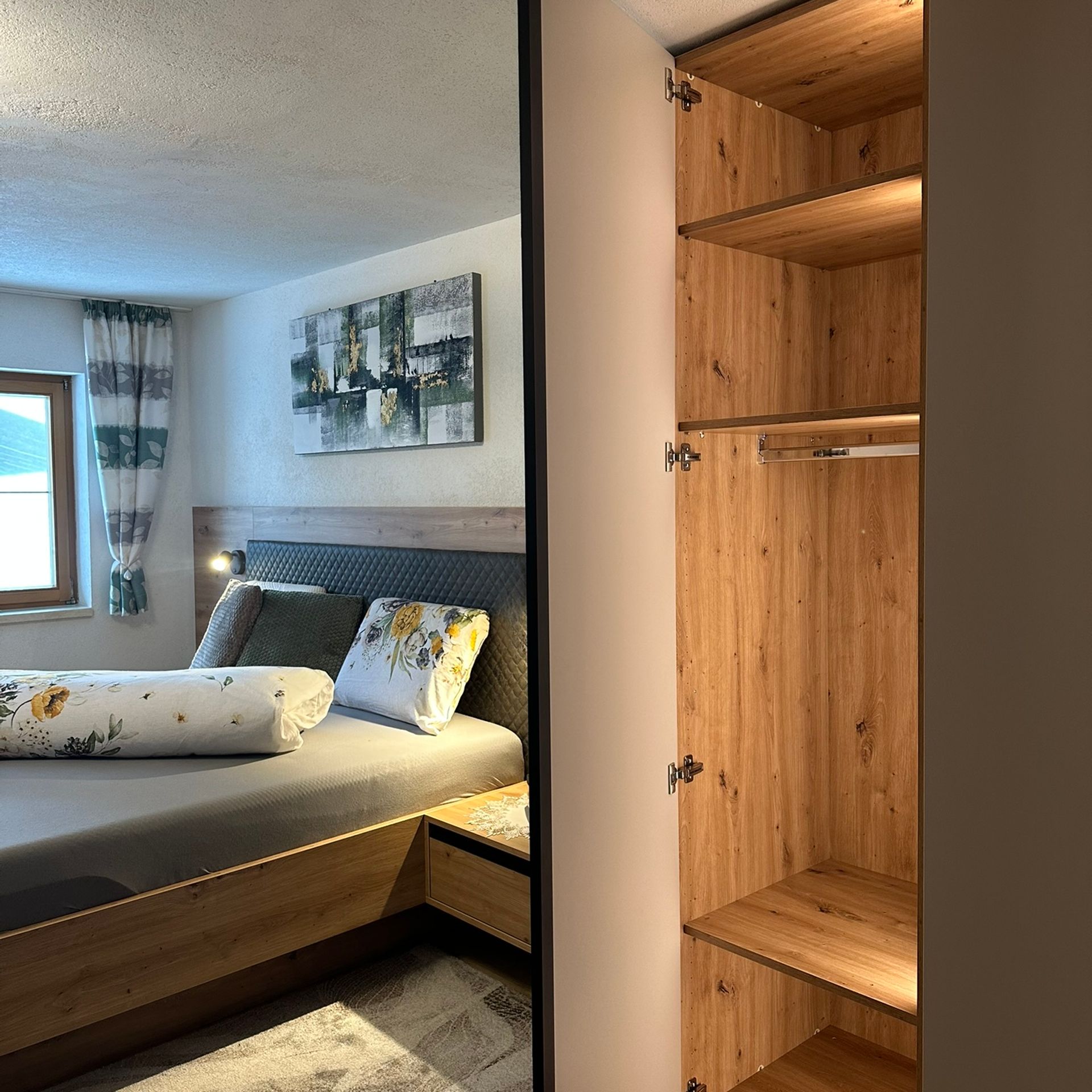 Ein zentrales Element ist die maßgefertigte Planung: Vom Bett mit integrierter Rückwand über die abgestimmten Nachtkästchen bis hin zur passgenauen Schranklösung wurde jedes Detail individuell auf den Raum und die Bedürfnisse der Bewohner abgestimmt. So entsteht nicht nur ein ästhetisches Gesamtbild, sondern auch maximaler Stauraum und Komfort – funktional, persönlich und bis ins Detail durchdacht.