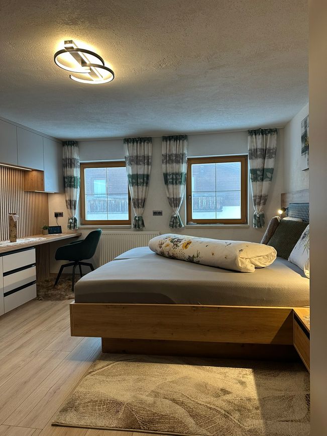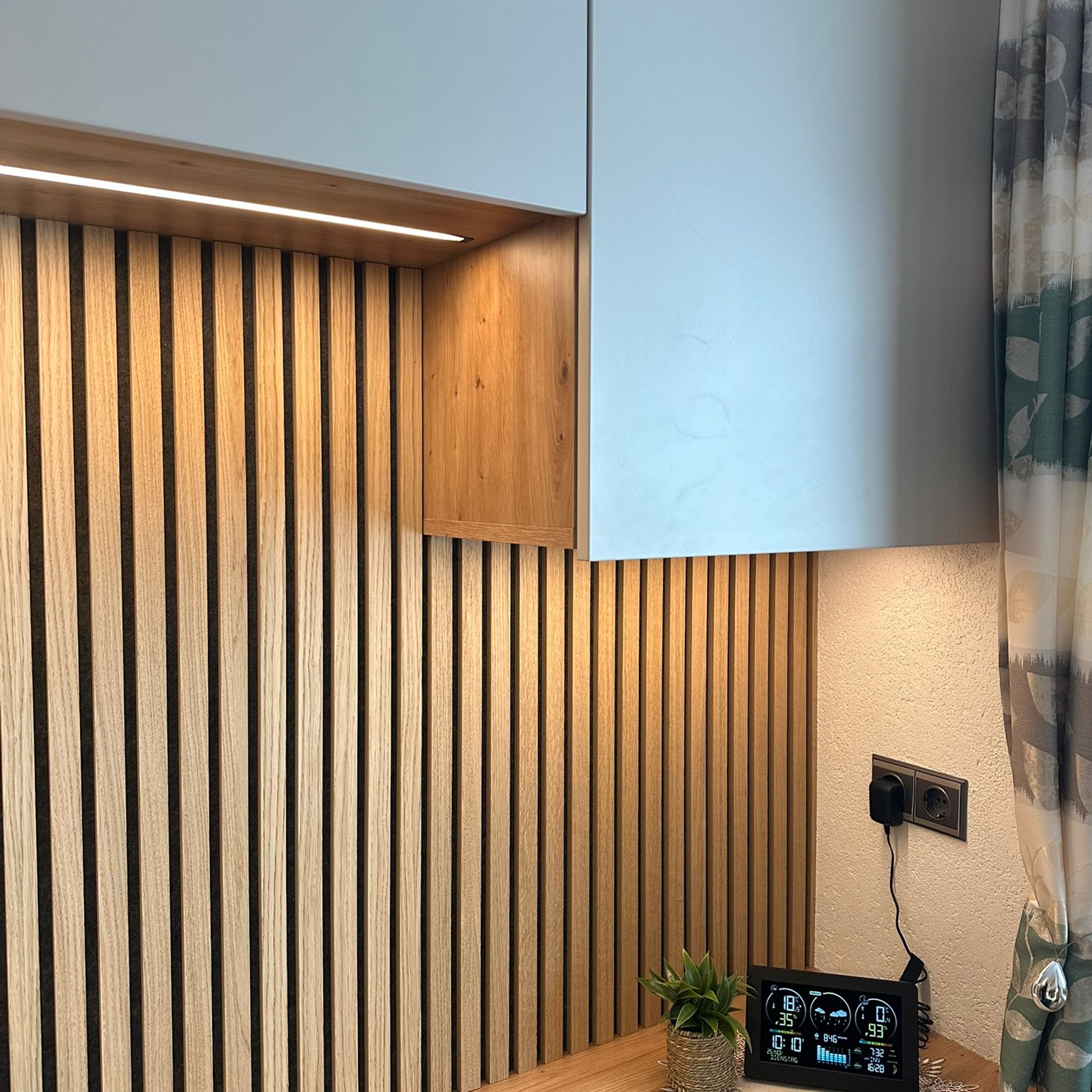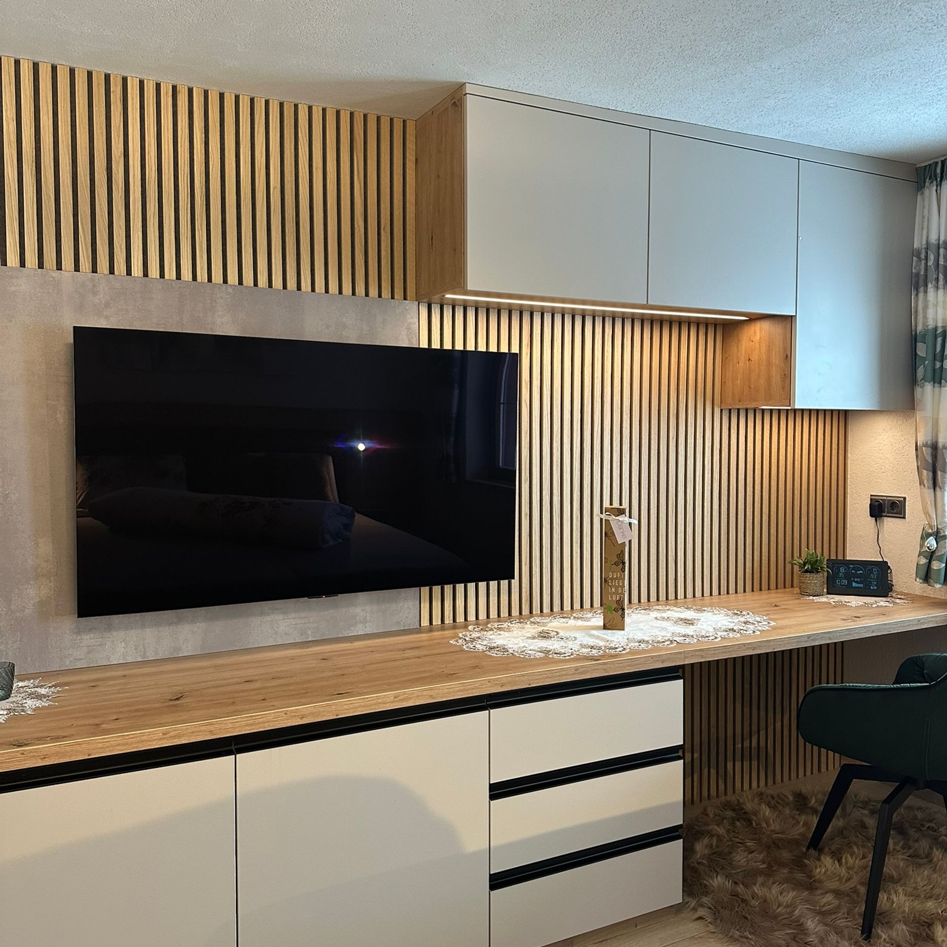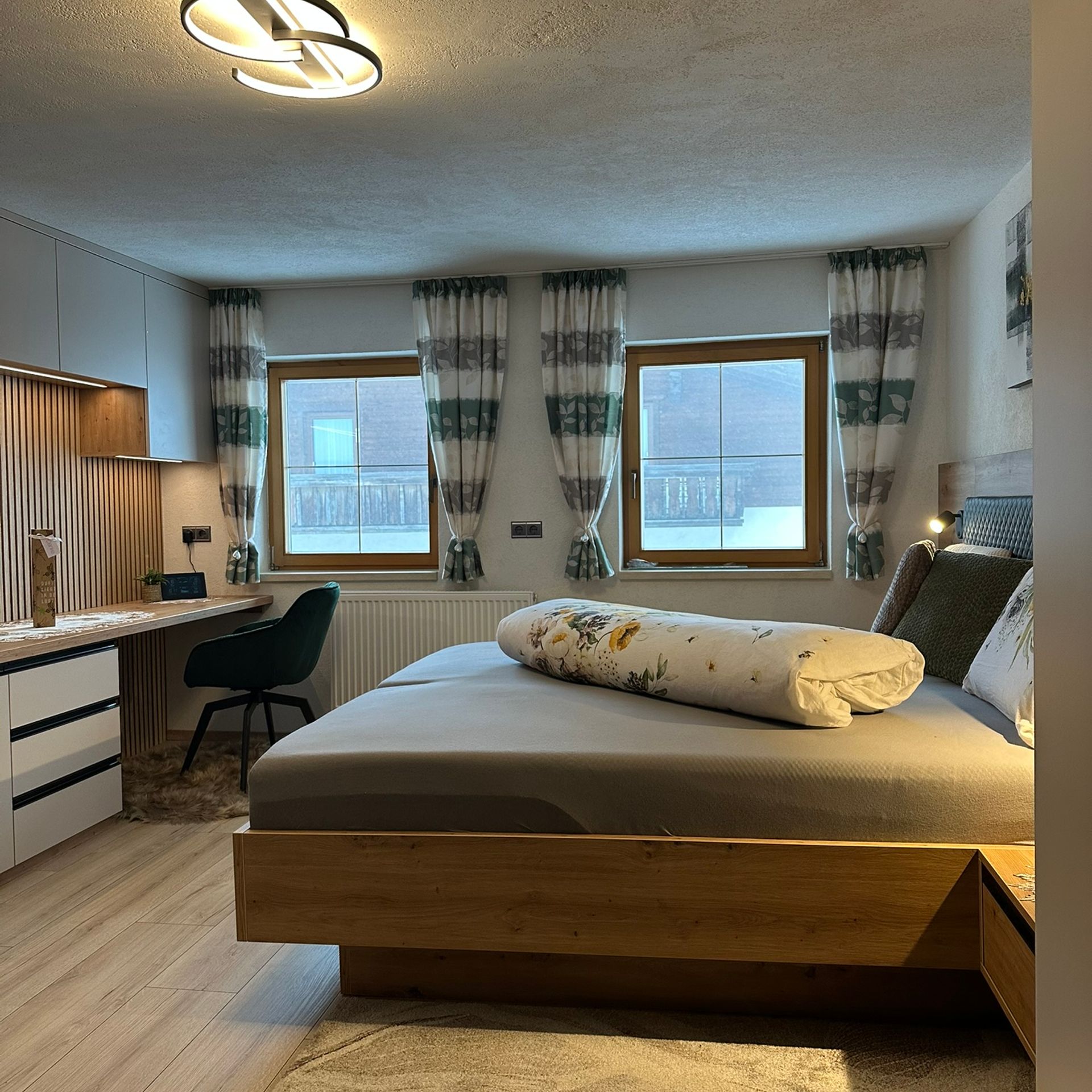 Ein zentrales Element ist die maßgefertigte Planung: Vom Bett mit integrierter Rückwand über die abgestimmten Nachtkästchen bis hin zur passgenauen Schranklösung wurde jedes Detail individuell auf den Raum und die Bedürfnisse der Bewohner abgestimmt. So entsteht nicht nur ein ästhetisches Gesamtbild, sondern auch maximaler Stauraum und Komfort – funktional, persönlich und bis ins Detail durchdacht.