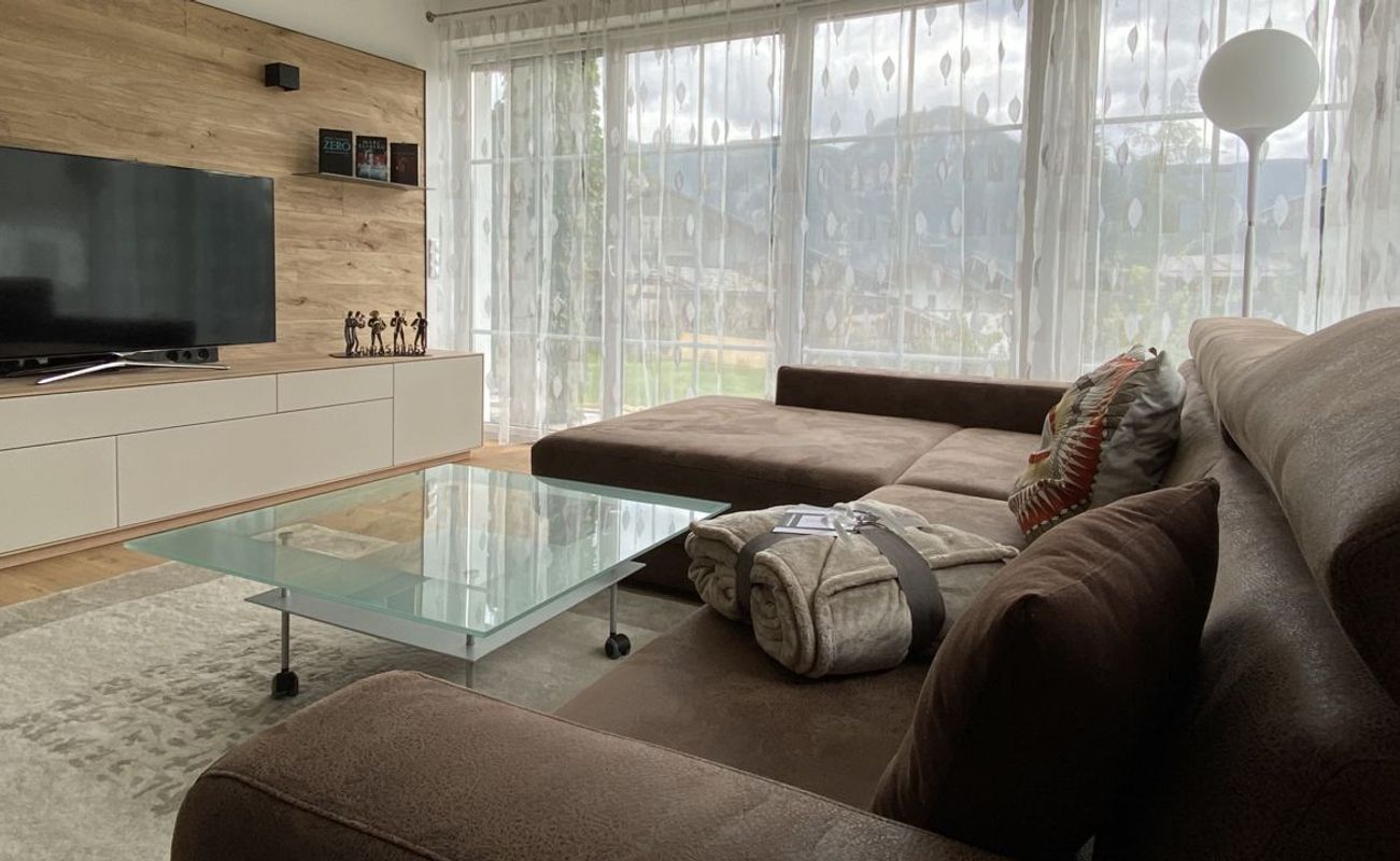 Wohnzimmer und Arbeits- bzw. Musikzimmer wurden rundum erneuert. Ein durchgehender, trendiger Boden und eine einheitliche Farbgebung verbindet die zwei Wohnbereiche zu einer harmonischen Einheit. Die ganze Familie fühlt sich im neuen Reich sehr wohl. Das Holz wirkt heimelig und schafft eine angenehme Atmosphäre, die Lichtstimmung ist perfekt und dank idealer Schranklösungen sind Unterlagen und Ordner perfekt verstaut.
